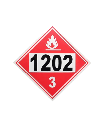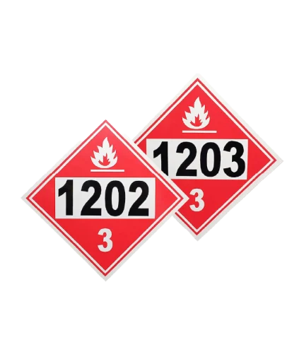 Señalización de seguridad industrial y ocupacional clase 3 para líquidos inflamables. En lado frontal, señalamiento impreso Clase 3 "1202" En lado reverso, señalamiento impreso Clase 3 "1203"