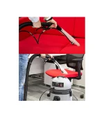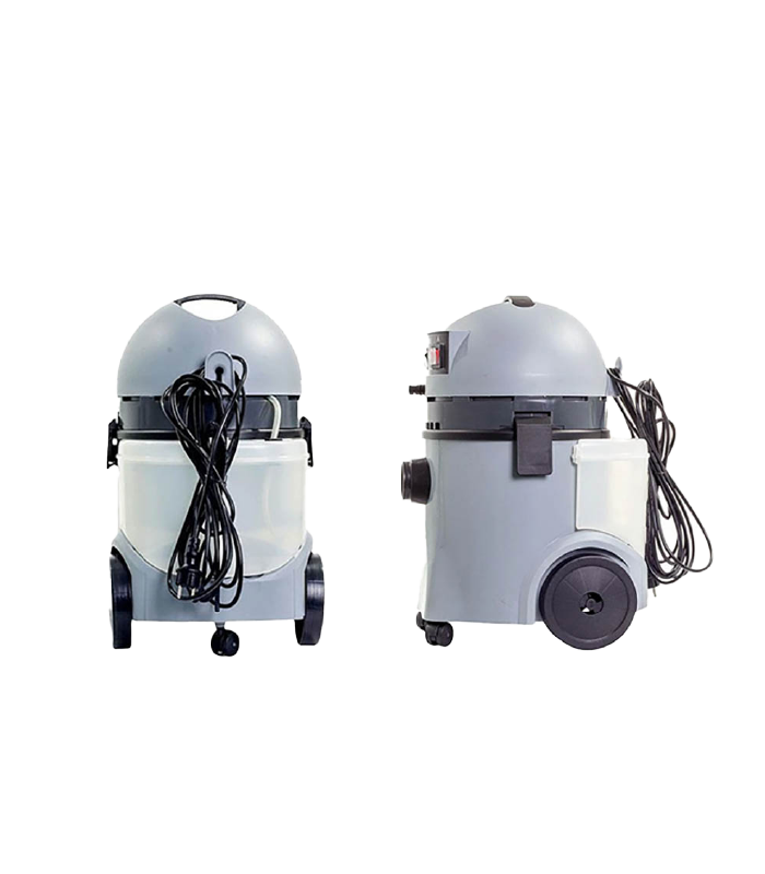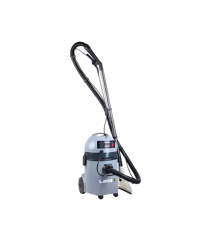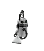 Aspirador de polvo con función inyección/extracción para alfombras, moquetas, sofás y sillones. Motor potente y silencioso de nuevo desarrollo (alta velocidad) con enfriamiento by-pass. Bomba de detergente a un máximo de 0,25 l/min. 2 bar máximo. Autonomía ilimitada recargable inmediatamente al encendido de indicador de luz. Depósito de plástico (PP) de 20 litros. Carro antichoques. Válvula de floradora para líquidos. Cable de alimentación de 7.5 m. Filtro lavable. Bolsa filtro recolectora.
