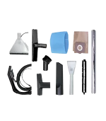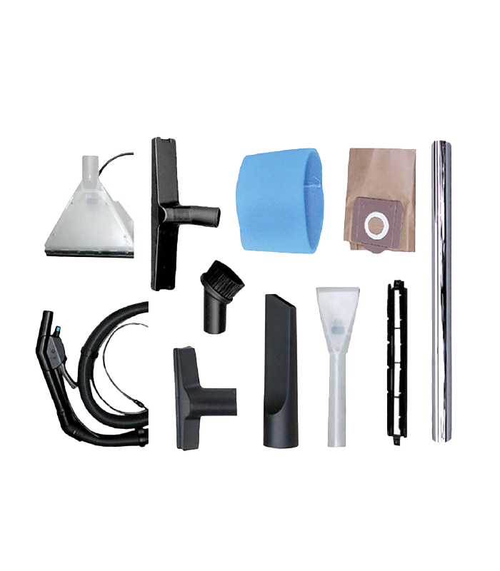Manguera flexible, Boquilla inyeccion/extraccion pequeña, Boquilla inyeccion/extracción, Tubos de extensión, Filtro lavable, Filtro de esponja, Filtro recolector bolsa de papel, Cepillo redondo, Cepillo cuerpo, Boquilla plana, Boquilla rectangular, Parte movible para polvo. |