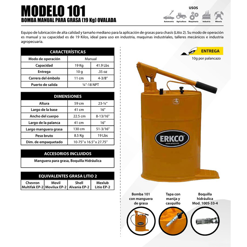 Bomba/cubeta para grasa manual, 19 Kg mod.101, Erkco