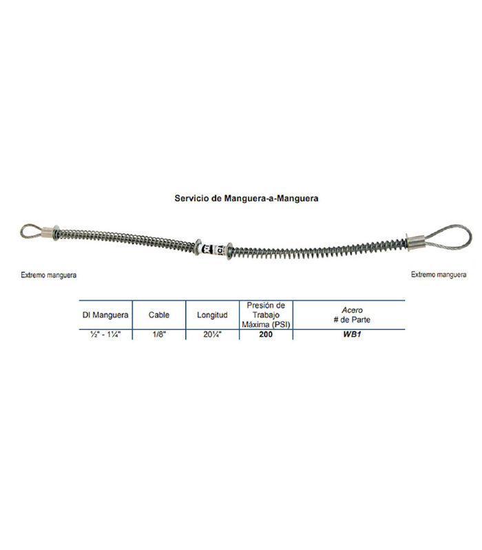 Cable de seguridad King. Debe ser instalada en posición extendida. El cable cubre las dos conexiones de manguera, brindando una posición segura para la manguera. Extremos de cable con acción por resorte abren fácilmente para un agarre firme de los acoples en la manguera. No requiere de herramientas, fácil de instalar y remover. Los cables se envían con etiquetas de seguridad adheridas. Altamente resistente al óxido y a la corrosión. Salida manguera-a-manguera. Presión de operación máxima: 200 PSI. Minimiza los daños al equipo y accidentes a los operadores en caso de que la manguera, acoples o abrazaderas presenten fallas o cuando haya una separación accidental.