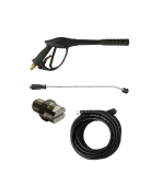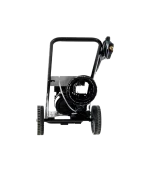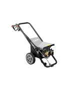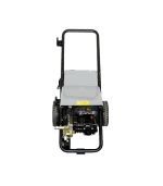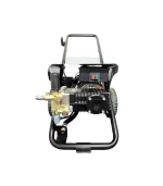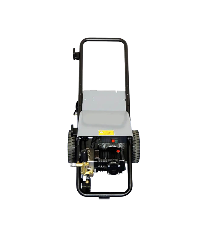 Hidrolavadora de uso profesional. Motor eléctrico de 4 polos (1750 RPM) refrigerado con agua y con protección térmica. Bomba lineal con 3 pistones en acero con pistones cerámicos, cabezal en latón con válvula by-pass incorporada. Total Stop retrasado y en baja tensión. Regulador de la presión. Manómetro en baño de glicerina.