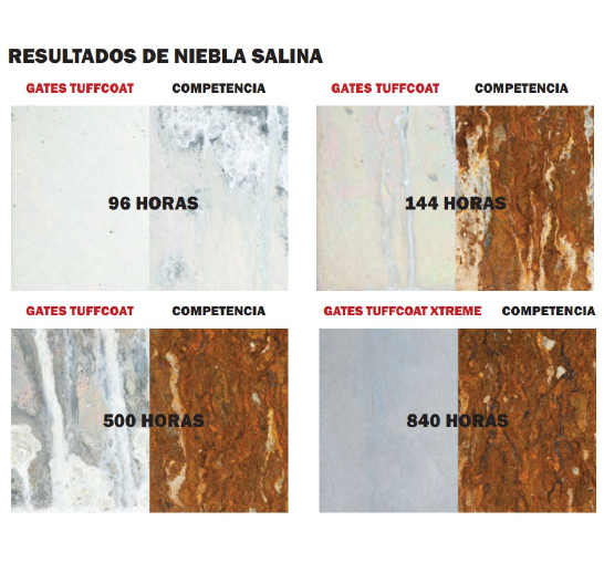 Sometidas a pruebas bajo las normas SAE J516 y ASTMB-117 y en condiciones de niebla salina, el recubrimiento TuffCoat proporciona más de 400 horas de protección contra la formación de óxido, 500% más que el estándar SAE de 72 horas.